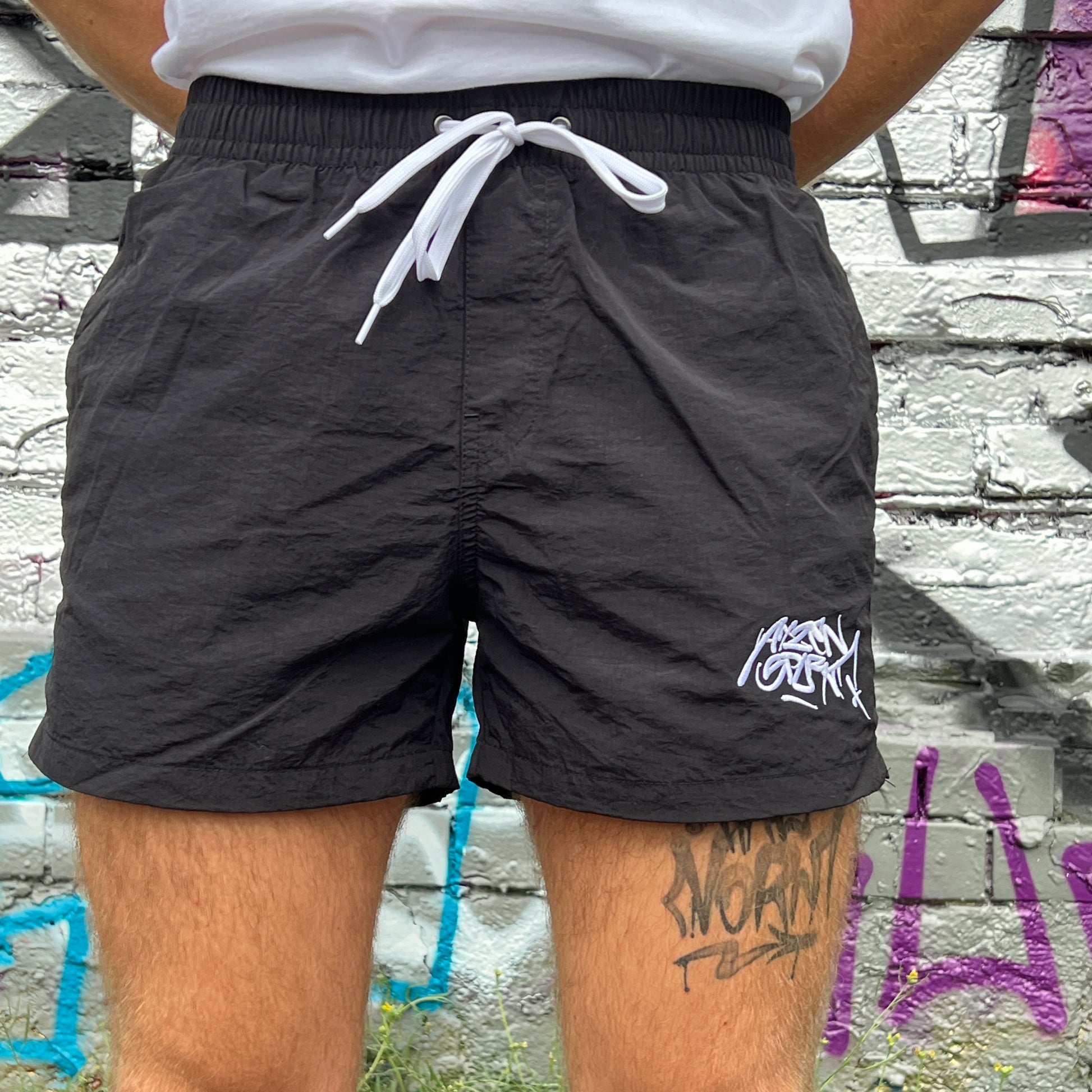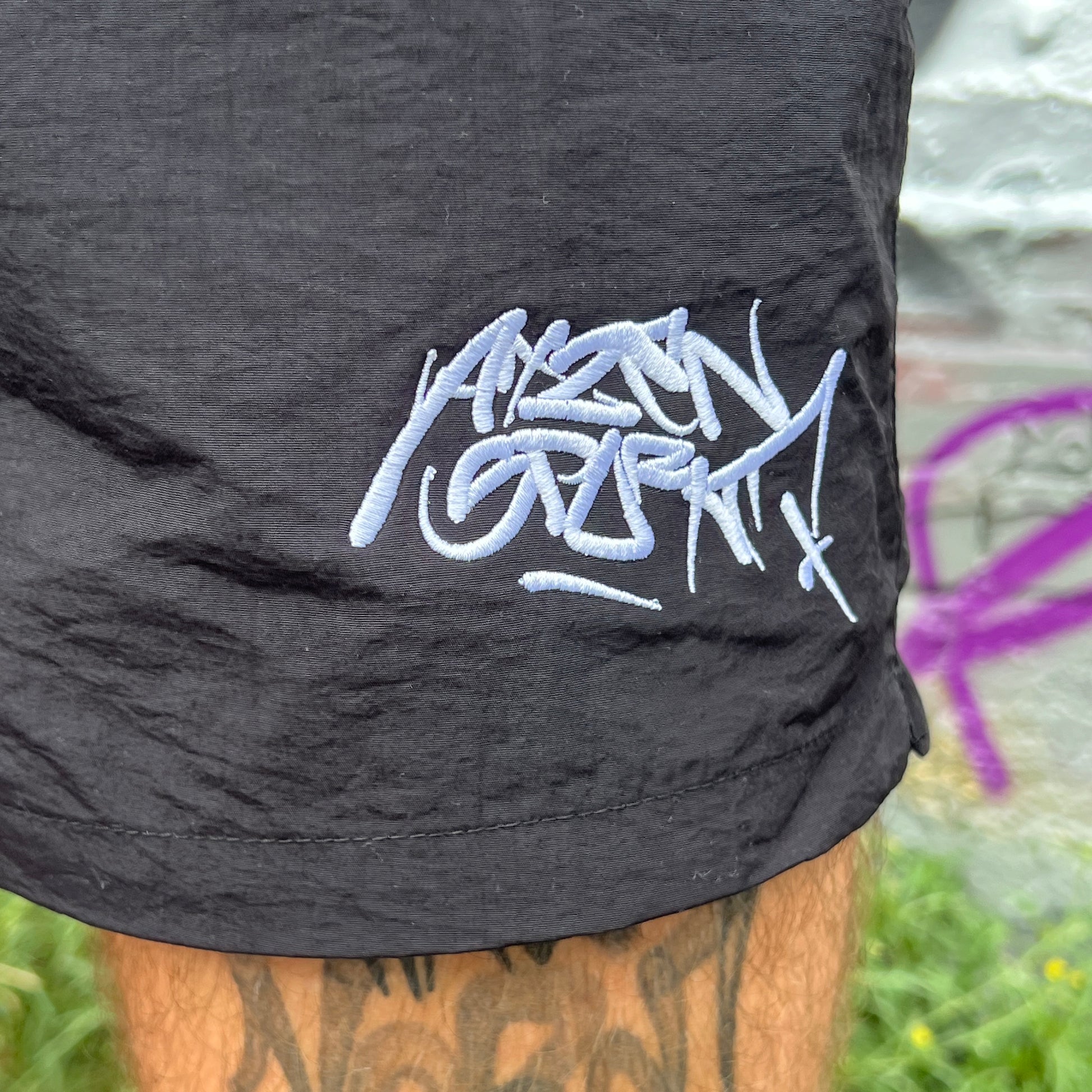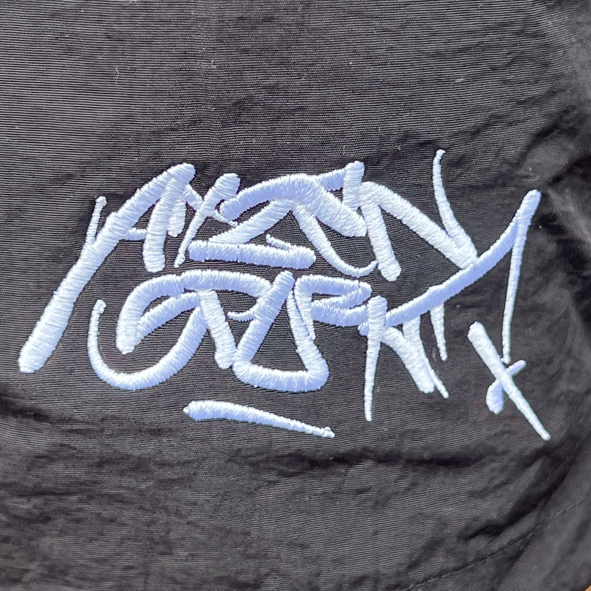 Der schwarze Stoff kommt mit weißem Stick an der Seite, inspiriert von echten Graffiti Artists und kompromisslos im Ausdruck.